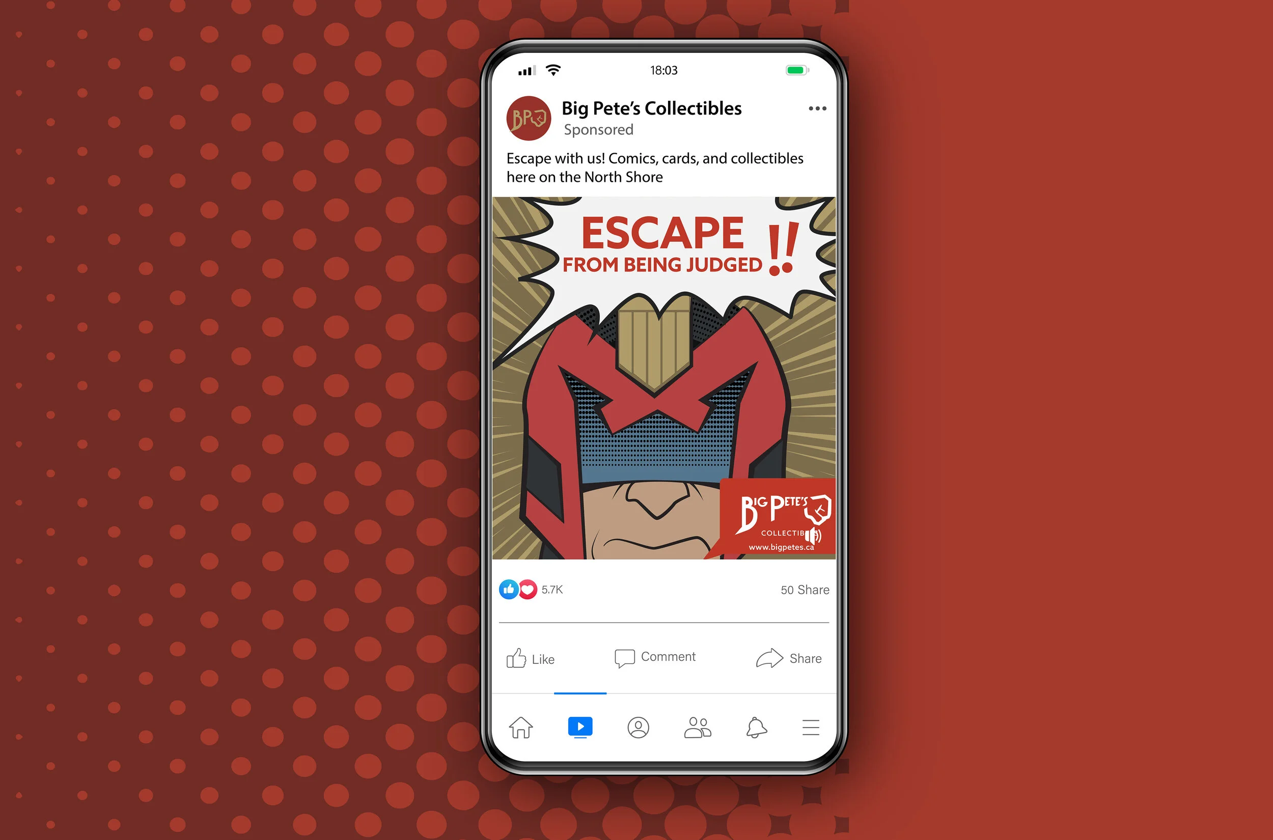 A conceptual rebrand of the highly-reputable comic book retailer in North Vancouver. The idea is bring familiar comic book graphics, colours, typography, and illustrated characters into a sleek visual overhaul. Additionally, new components are added, including several advertising strategies, a functional mobile app, an updated website, and new in-store brand amenities.